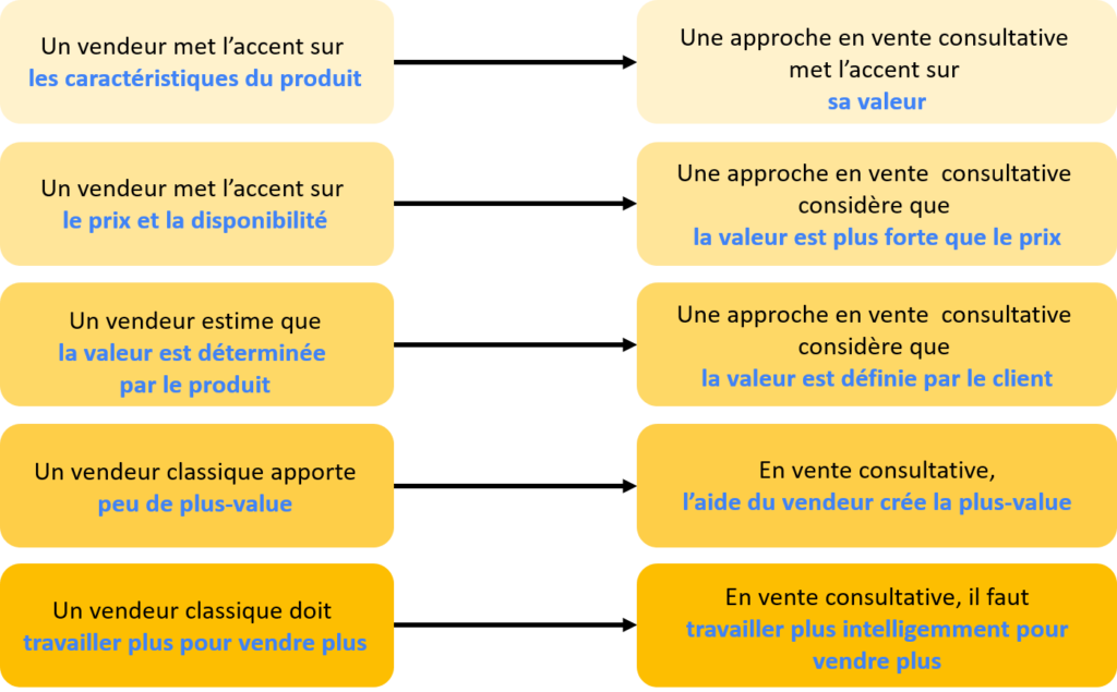 Comme vendeur, la vente consultative vous fait changer le paradigme : vous n’êtes plus là pour conclure, vous êtes là pour trouver une solution.